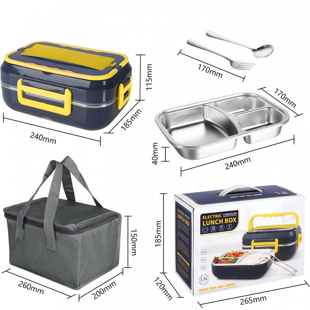 Технические характеристики Ланч-бокс с подогревом Volt 12В/24В/220В + термосумка и приборы, судочек для обеда в авто и офис 1.5л, синий