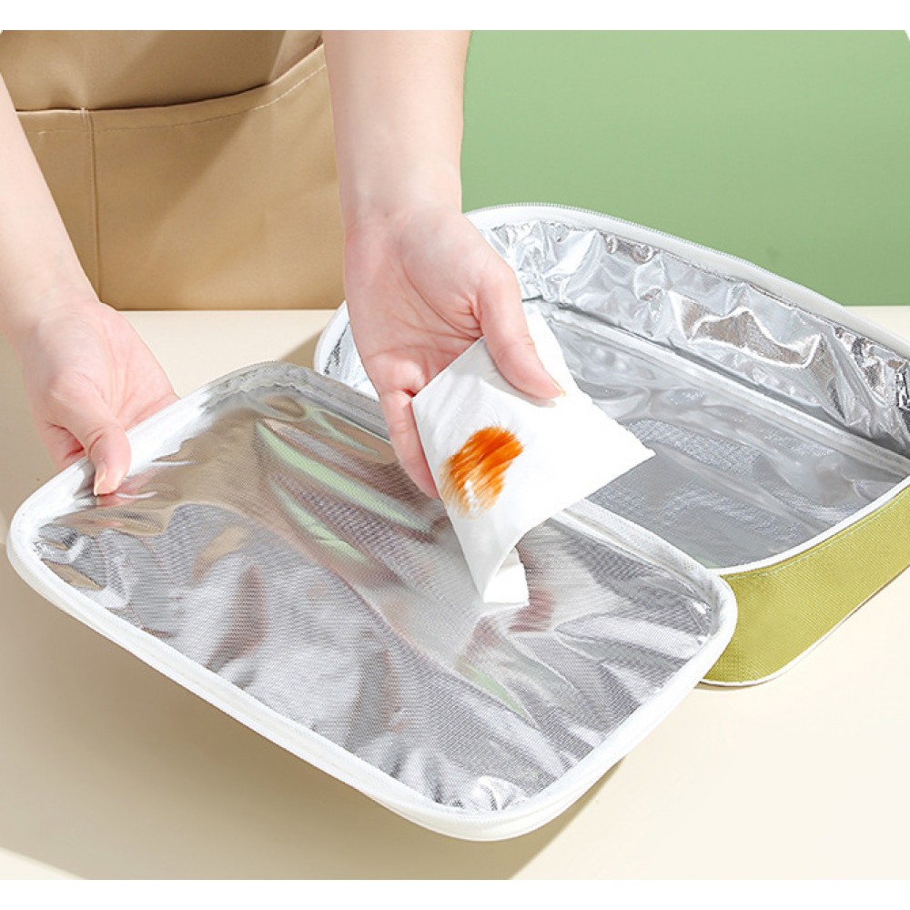 Изготовлена из плотной водоотталкивающей ткани с фольгированным теплоизоляционным слоем внутри — помогает сохранять тепло или прохладу еды. Имеет удобную ручку сверху и сбоку. Легко очищается и не впитывает запахи.