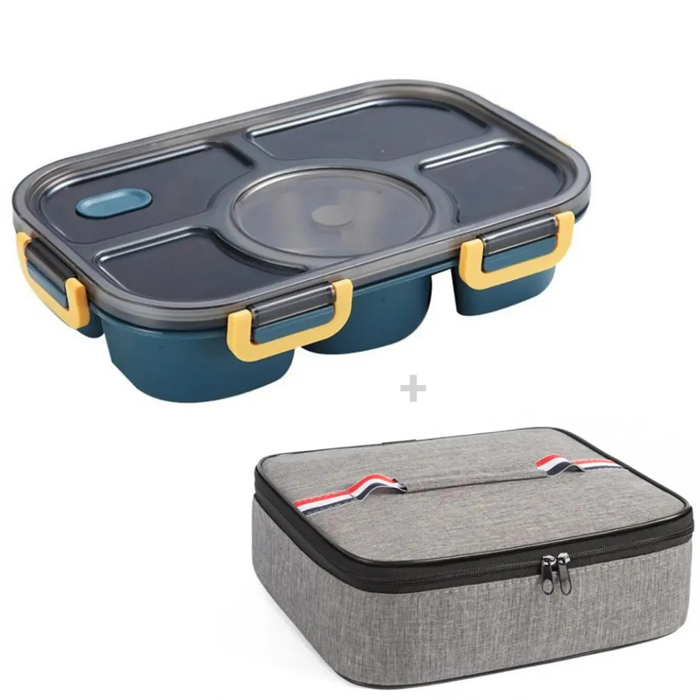 Комплект для зручного ланчу всюди: герметичний пластиковий ланчбокс на 5 відділень (1.5 л) + плоска термосумка Slim. Практичне рішення для школи, роботи, прогулянок або поїздок. Ланчбокс надійно зберігає страви окремо, а термосумка підтримує температуру та не пропускає запахи.