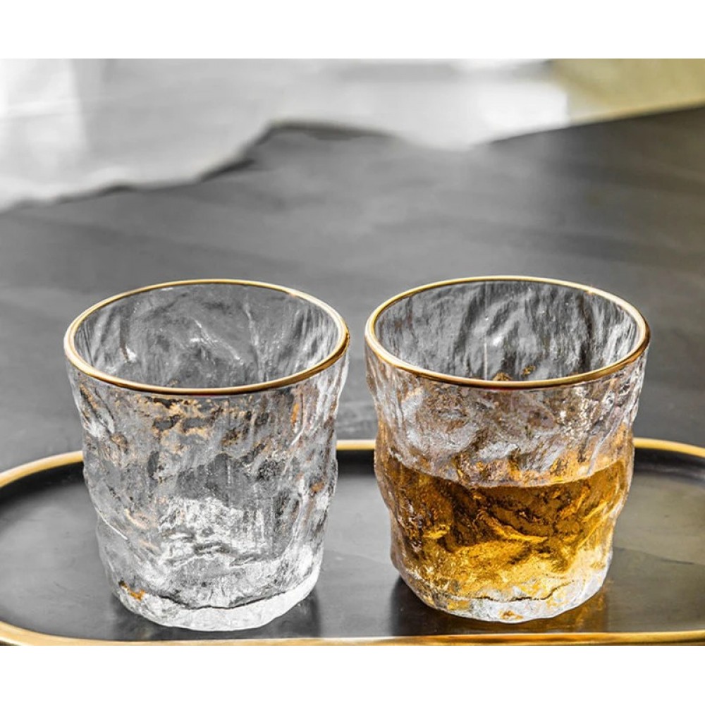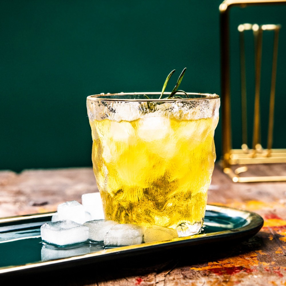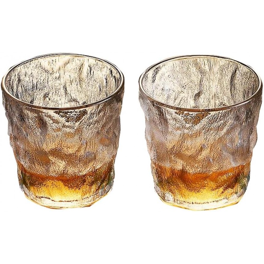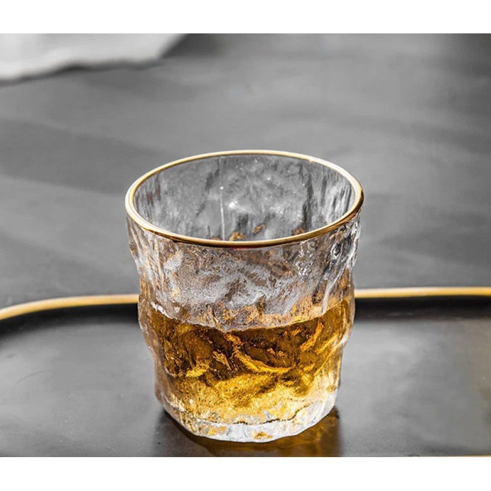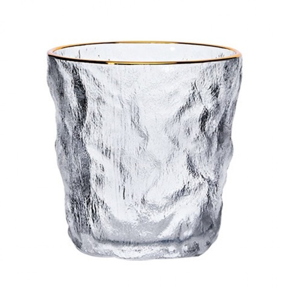 Набір із двох стильних склянок Glacier з рельєфним малюнком та витонченим золотим обідком — ідеальне поєднання елегантності та практичності. Склянки виготовлені з товстого прозорого скла, яке комфортно лежить у руці та красиво відбиває світло. Вони чудово підходять для подачі віскі, рому, коктейлів, води або соку.