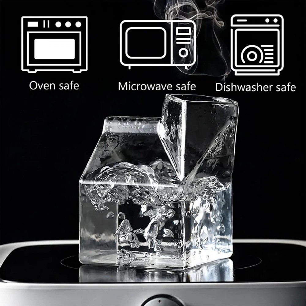 Оригінальна склянка-молочник у формі пакета для молока стане стильним акцентом вашої кухні або чудовим подарунком. Виготовлена з термостійкого боросилікатного скла, вона витримує як гарячі, так і холодні напої. Завдяки прозорому дизайну напій виглядає ефектно — ідеально підходить для кави, латте, молока, соків, коктейлів, десертів чи сервірування сніданку.